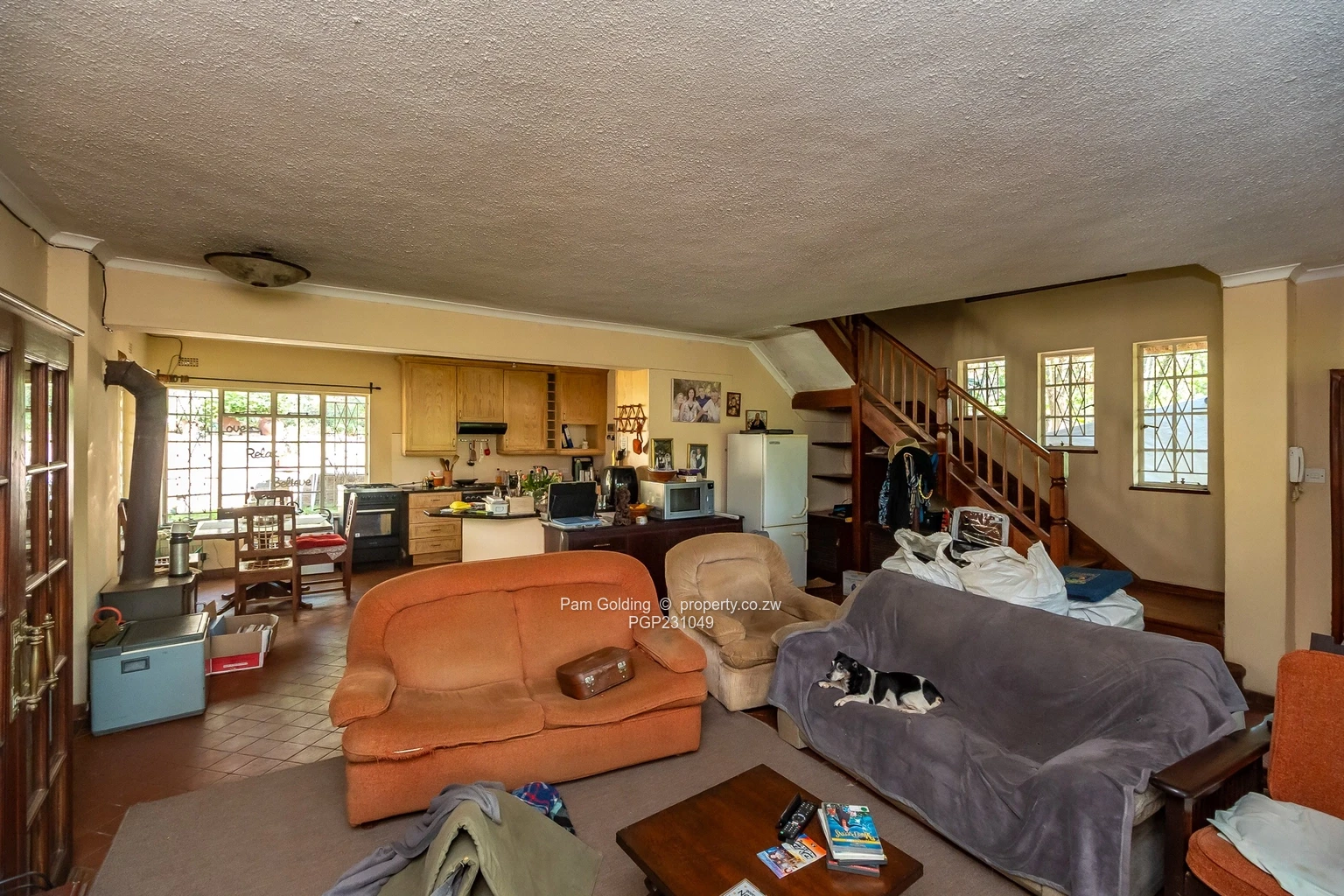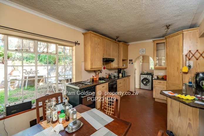 The residence boasts five spacious bedrooms and two well-appointed bathrooms, catering to both family living and entertaining. The inviting lounge serves as a perfect gathering space, while the dining room flows seamlessly from the kitchen. The warmly designed kitchen features wooden cabinetry, a gas stove, and large windows that invite stunning garden views, enhancing the welcoming atmosphere.