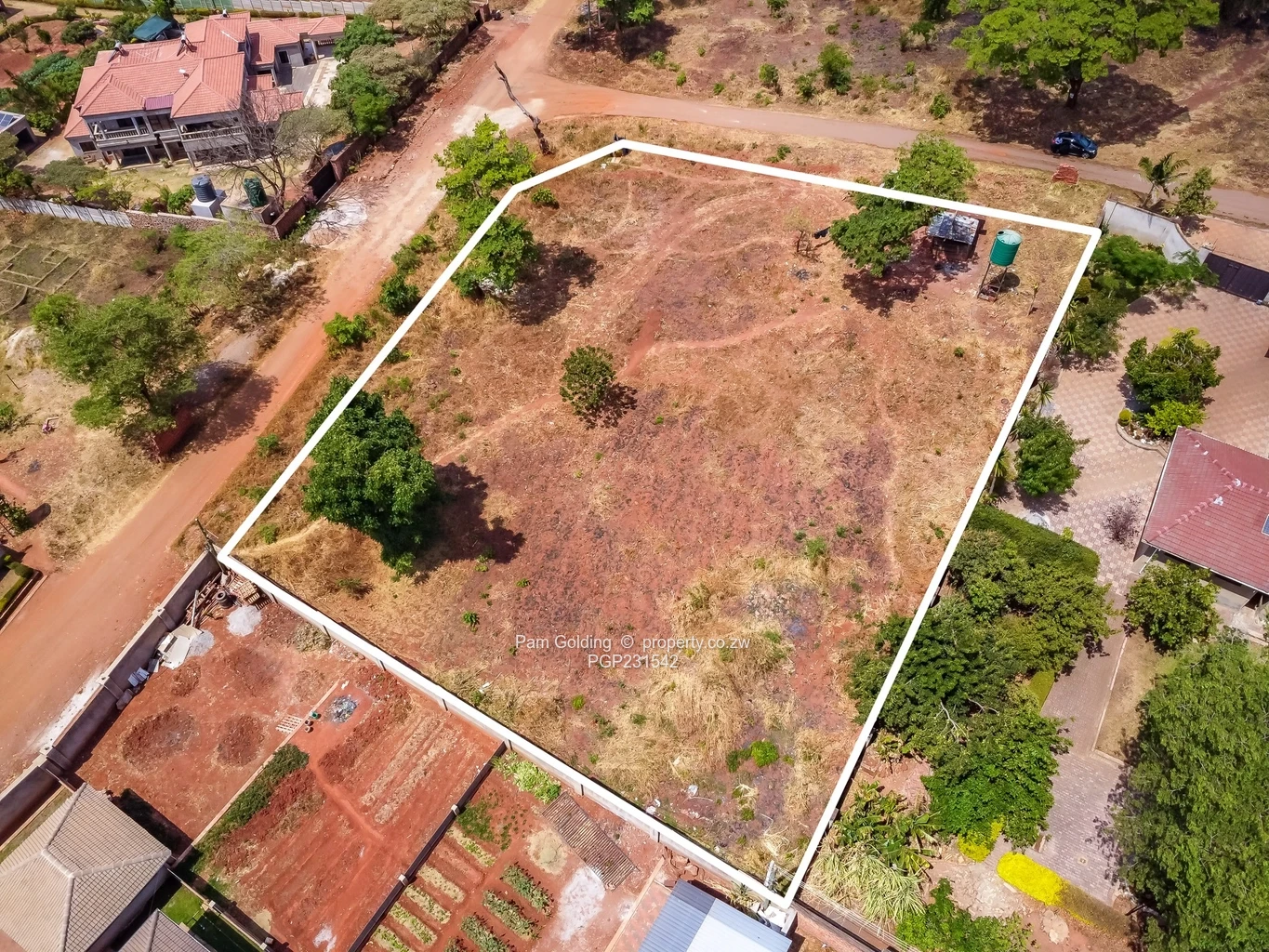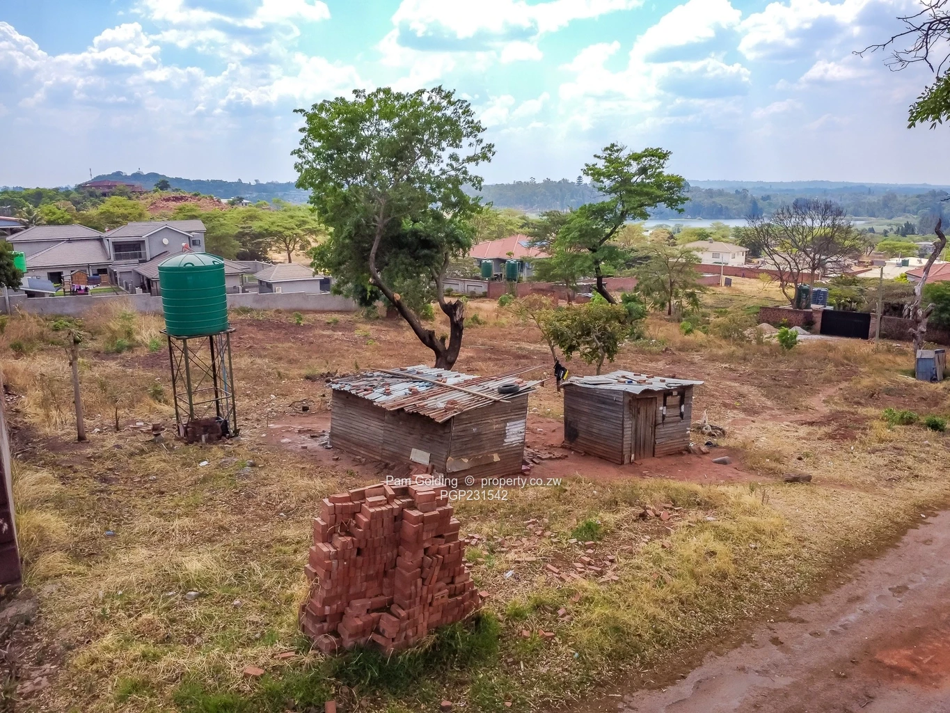 The stand is serviced with essential utilities, including municipal water, sewer line, and electricity (Zesa), ensuring convenience for future development. A distinctive green water tank prominently stands, indicating immediate access to water resources. Ownership under Developer's Cession.